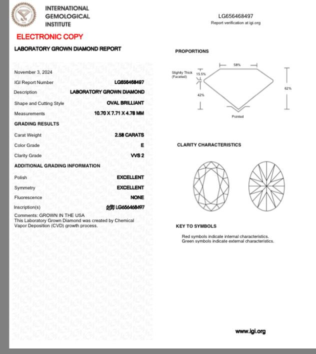 Delicate 2.50-Carat Oval Cut Lab Diamond Graded At E Color, VVS2 Clarity, Excellent Symmetry And Polish IGI Certificate.