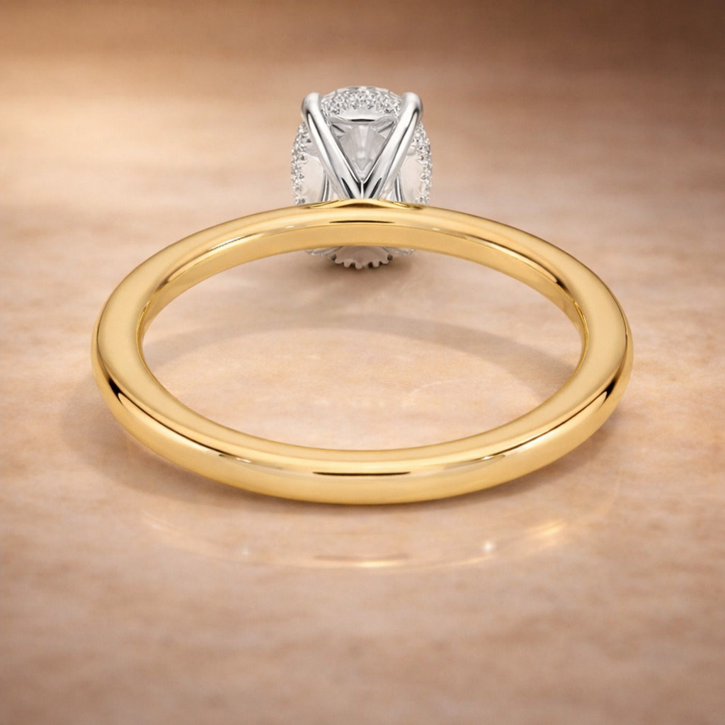 This elegant 2 carat oval diamond engagement ring is crafted in a refined two-tone gold design, featuring a warm yellow gold band paired with white gold prongs that enhance the brilliance of the center stone.