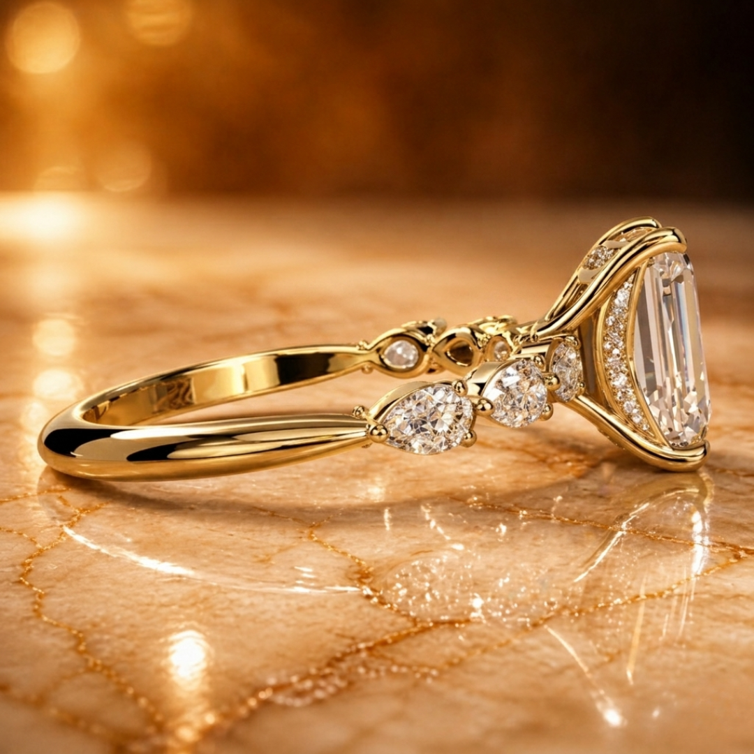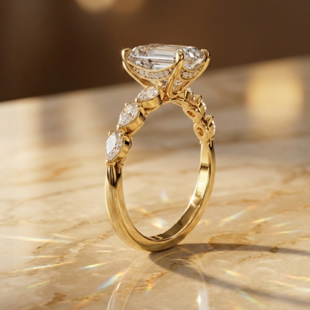 Elegant Emerald Cut Lab Diamond Ring with Pear Shape Side Stones