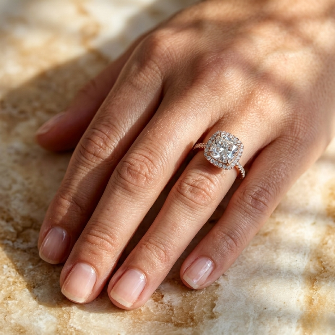 3 Carat Cushion Cut Diamond Halo Engagement Ring – 14K Rose Gold