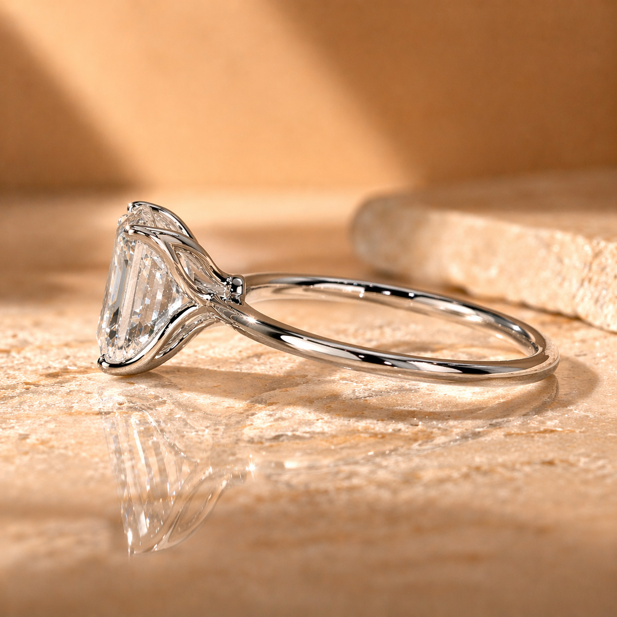 The centerpiece is a breathtaking 3 carat emerald cut lab-grown diamond, carefully selected for its superior quality and brilliance.