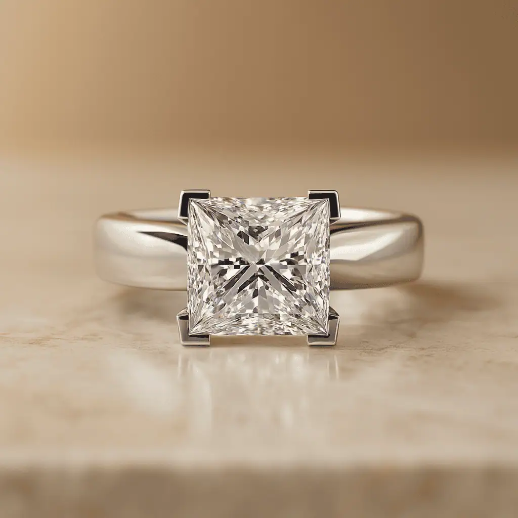 3 Carat Princess Cut Center Stone – Offers sharp square lines and expansive brilliance, with F color ensuring icy whiteness and VVS2 clarity for luxurious sparkle.