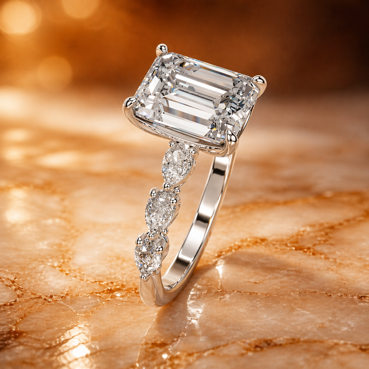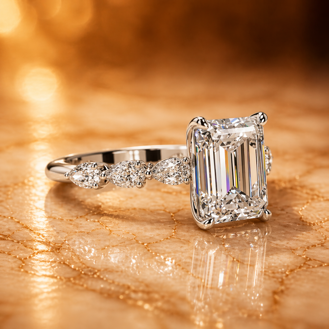 Elegant Emerald Cut Lab Diamond Ring with Pear Shape Side Stones