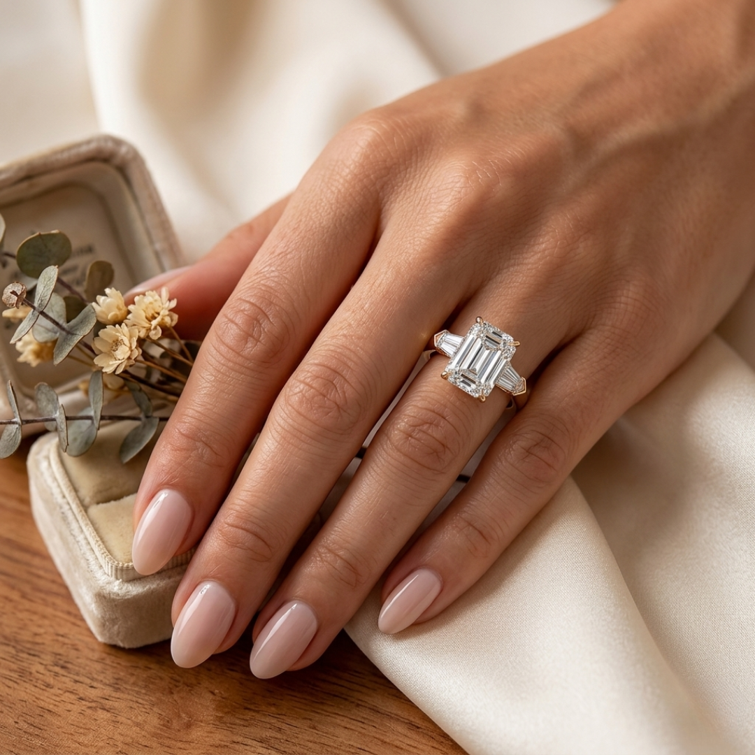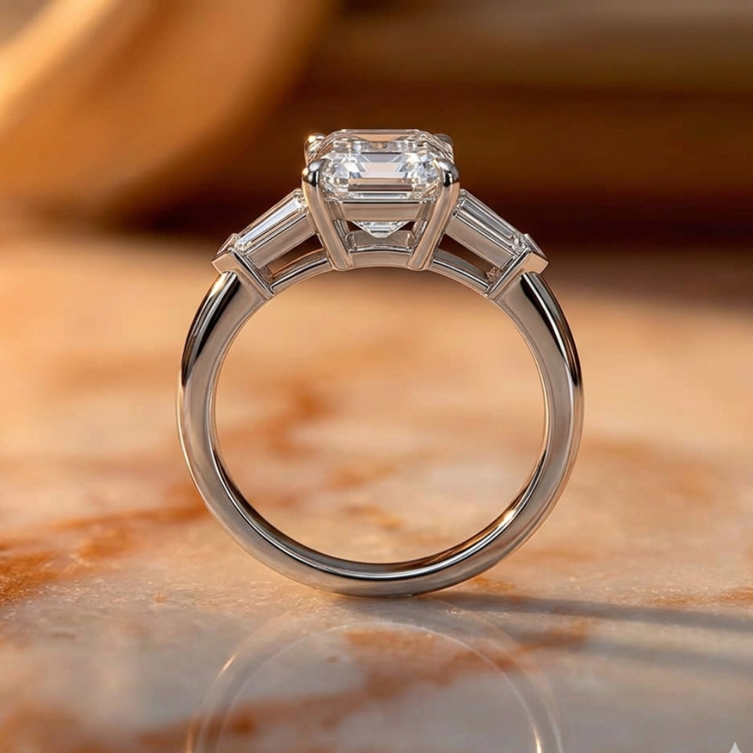 This emerald cut three-stone engagement ring offers the perfect balance of elegance, brilliance, and timeless design.