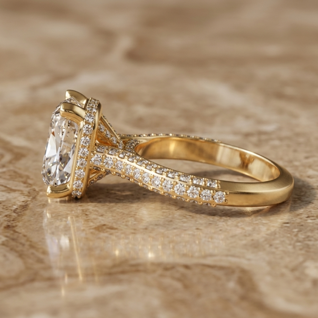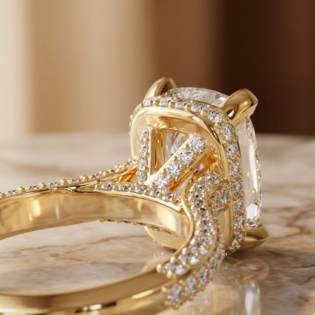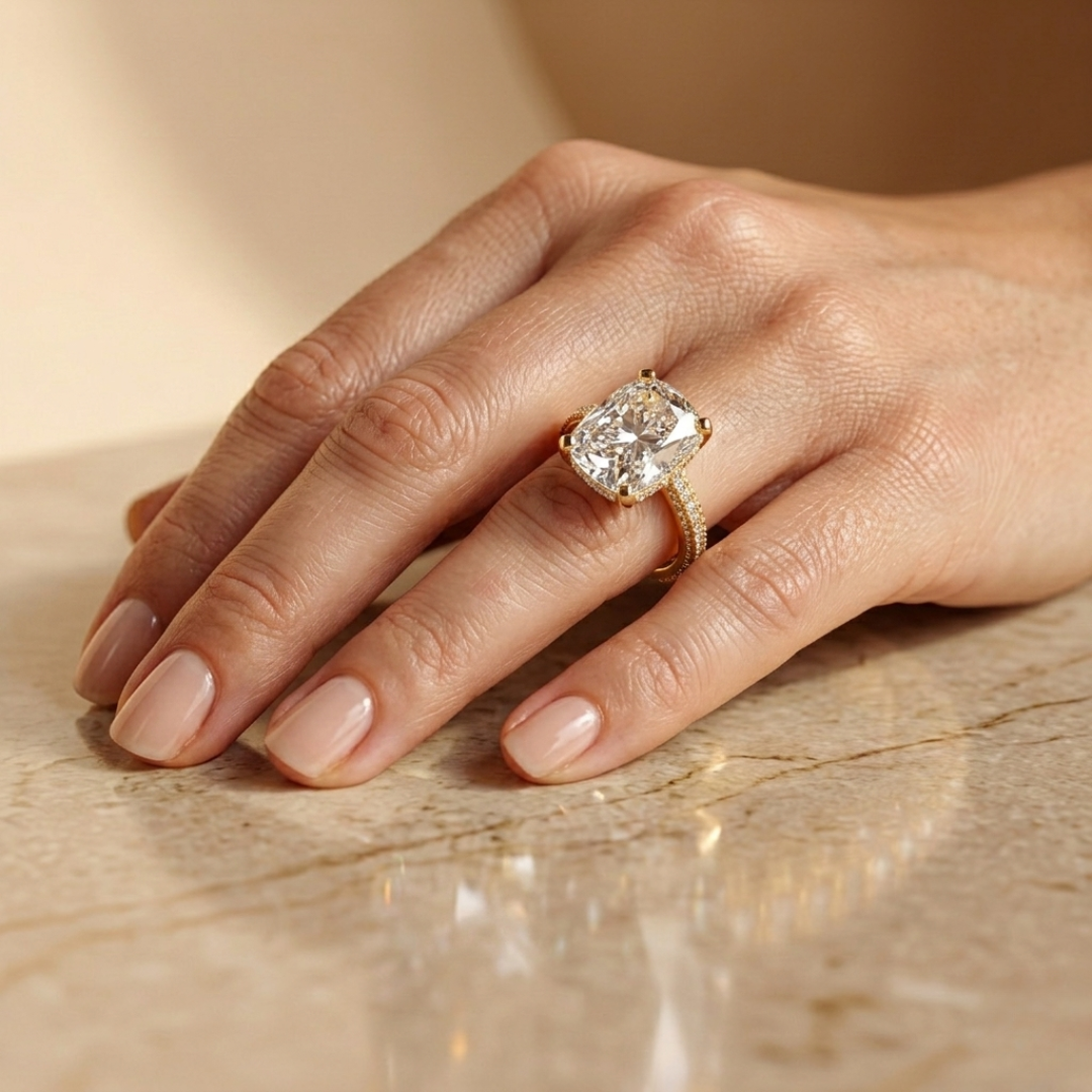 5 Carat Cushion Cut Lab Diamond Engagement Ring – Hidden Halo in 14K Yellow Gold